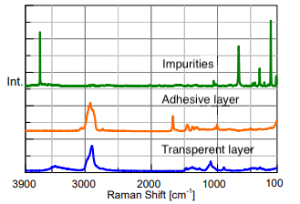 The upper part of Fig. 30 shows an example of foreign matter buried in a multilayer substrate consisting of glass, adhesive, and a transparent film. Such foreign matter is difficult to analyze in cross-section due to the presence of glass, and the adhesive layer is also removed when removing the foreign matter, which makes it difficult to measure using micro-FTIR. On the other hand, in Raman measurements, the use of confocal optics enables selective acquisition of the spectrum at the position where the laser is focused. As a result, nondestructive and noncontact measurement of the inside of the sample can be easily performed without complicated pretreatment. Here, the location of foreign matter was measured in the depth direction (Z-axis direction), and information on each layer was also acquired. The representative spectra (lower figure) obtained in each layer are shown.
