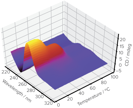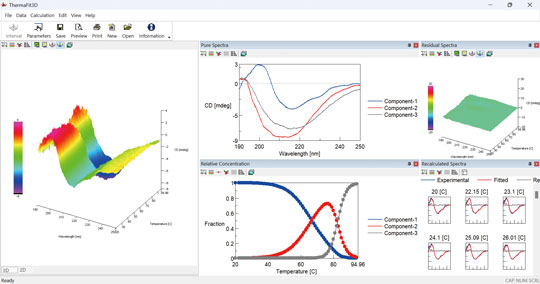 By applying MCR-ALS constrained by thermodynamic models to temperature-dependent CD spectra (3D CD spectra), it is possible to obtain spectra of pure components, concentration profiles of each component, and thermodynamic parameters for each phase transition (Tm, ΔH, ΔS). ThermaFit3D automatically provides residual spectra, helping confirm the reliability of every analysis.
