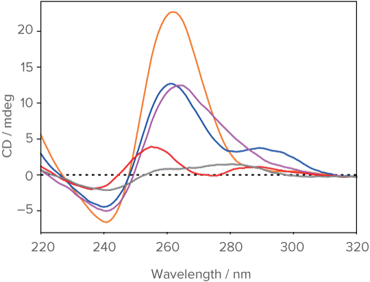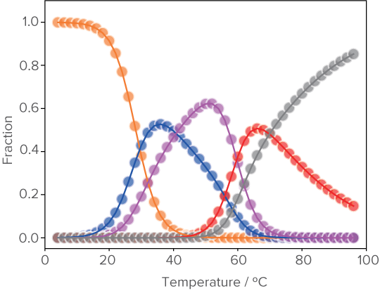 Beyond canonical double-helical structure, nucleic acids are capable of adopting diverse high-order structures, including triplex and quadruplex. Furthermore, it has been reported that these higher-order structures exist in equilibrium states and dynamically change in response to the surrounding conditions. However, extracting information from complex, mixed samples is not straightforward. ThermaFit3D analyzes CD data to break down complex higher-order structures and reveal their proportions.