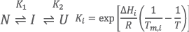 KD is the ratio of [N] and [D], and is calculated by using the experimental data, which is the measured CD values θi as a function of temperature Ti. This program approximates θi by the following equation, and calculates the KD.