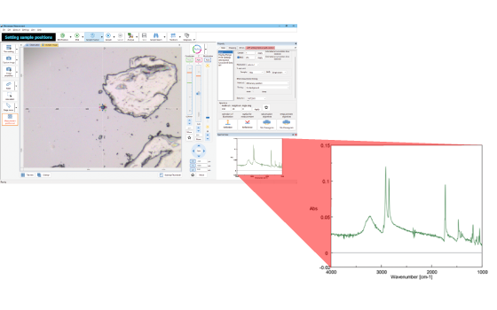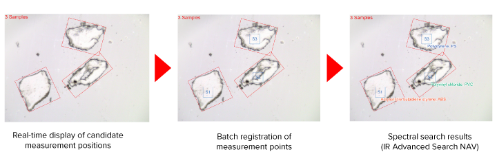 IR Advanced Search NAV filters measurement targets based on sample characteristics, such as size and circularity, displaying the spectral search results in real time on the observation image.