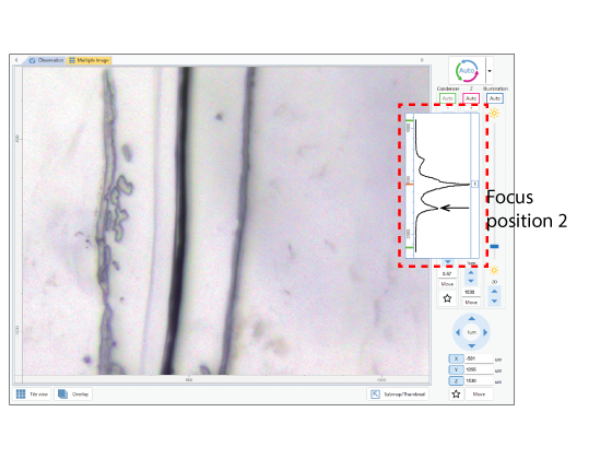 Samples pressed onto substrates, such as KBr or diamond, have several focal positions (e.g., the top surface, sample surface, and bottom surface), which can make precise focusing on the sample surface challenging. The autofocus function provides a numerical focus profile displayed as a graph, allowing users to easily identify the optimal focal position. Clicking on a peak in the graph automatically moves the stage to the corresponding Z-position. In addition, the system allows registration of frequently used focus positions, which streamlines focus adjustments for different samples and significantly improves workflow efficiency.