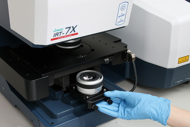 A convenient slide-in mechanism enables the quick and effortless exchange of the condenser mirror to change magnification. The IRT-7X supports reflection measurements for samples up to 40 mm thick.