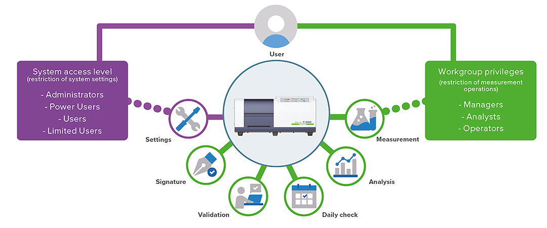 The user can be registered with two independent authorization levels (system settings and measurement operations) based on the their needs. Access to unnecessary functions can be restricted, preventing accidental changes to measurement parameters.