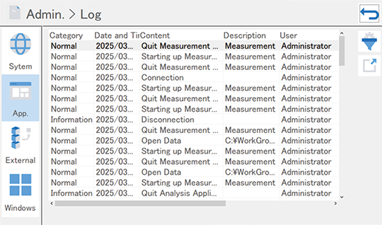 User actions in the software are recorded in logs under respective categories. These logs can be exported as text data to a specified folder.