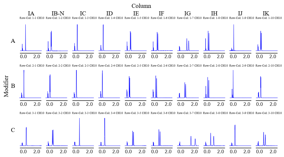 The column stabilization time during screening was set to 10 min only for the first column after solvent changeover and 3 min for the other columns, taking into account solvent substitution in the system. The analysis time was set to 3.0 min. The total required time for this screening was 3.4 hours per compound. Figure 1-1 shows the screening results obtained using a photodiode array (PDA) detector at a wavelength of 230 nm, and Figure 1-2 shows those obtained using a CD detector at a wavelength of 250 nm. Each row of chromatograms represents a different modifier solvent, and each column of chromatograms represents a different chiral column. In the CD chromatograms, different optical isomers produce signals with opposite signs.