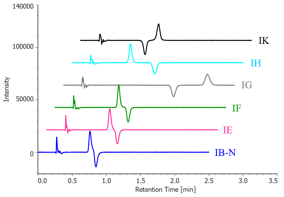 Figure 2 shows the CD chromatogram of a column that achieved chiral separation under conditions using t-butyl methyl ether/ethanol (80/20) as a modifier. By obtaining the CD chromatogram using a CD detector, it was found that IG and IK exhibited a reversal in elution order compared to other columns.