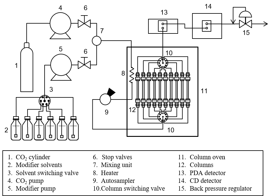 Supercritical fluid chromatography (SFC) uses carbon dioxide as the main solvent in the mobile phase and is characterized by its ability to maintain high separation efficiency even when performing analyses at high flow rates (linear velocity). Among the sample components that are separated and fractionated by taking advantage of this feature are chiral compounds. To investigate the optimal separation conditions for chiral compounds, a screening method is used to comprehensively analyze individual substances using solvents and columns. Recently, chiral columns with a 3 µm particle size have been developed for SFC, and are expected to provide faster and more efficient chiral-compound separation than conventional SFC using 5 µm particle-size columns.