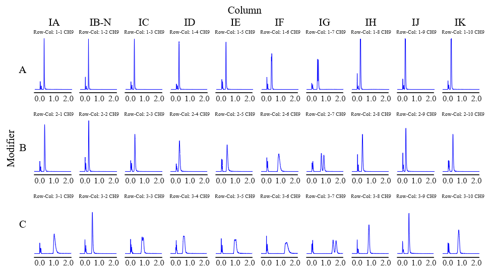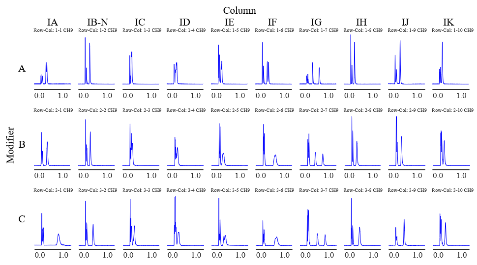 Figure 1 and Figure 2 show the screening results for flurbiprofen and ketoprofen, respectively. Each row of chromatograms represent a different modifier solvent, and each column of chromatograms represents a different chiral column.