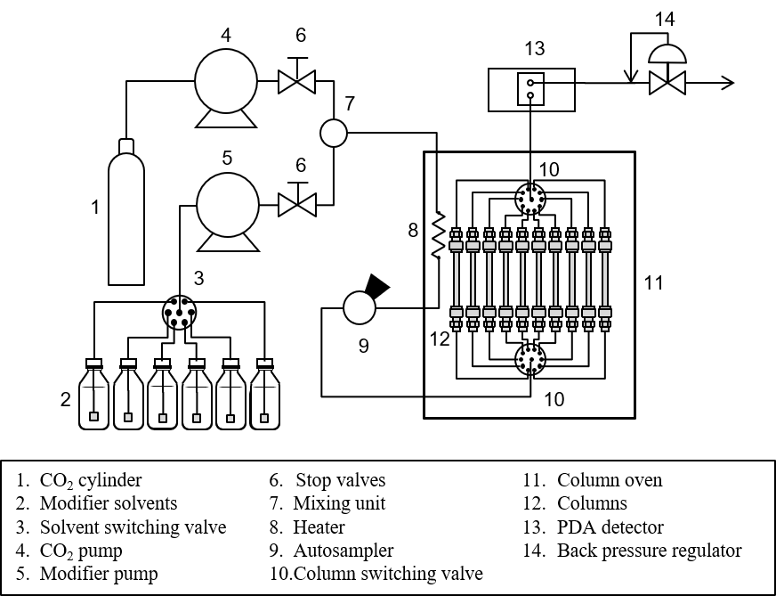 The column stabilization time during screening was set to 10 min only for the first column after solvent changeover and 3 min for the other columns, taking into account solvent substitution in the system. The analysis time was set to 3.0 min. The total required time for this screening was 3.4 hours per compound.