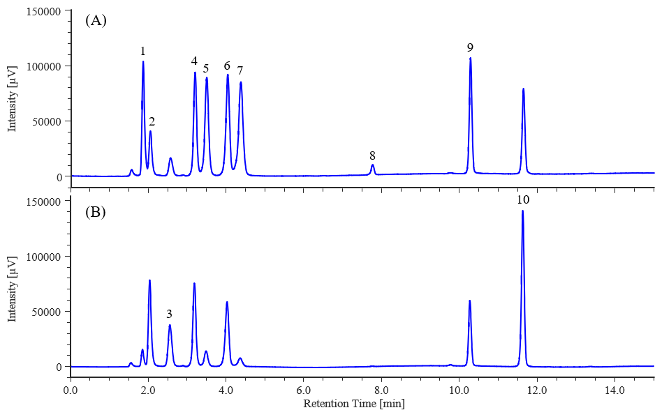 Fig. 1 Chromatograms of water-soluble vitamins (10 mg/L each) (A): 210 nm, (B): 260 nm