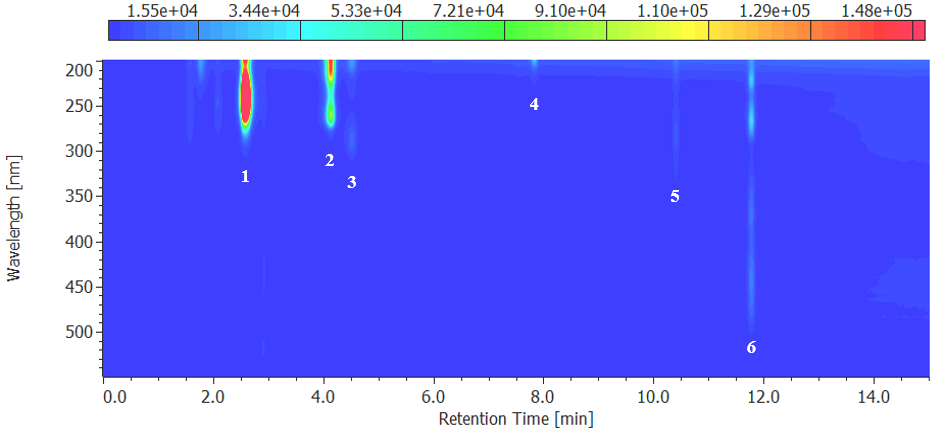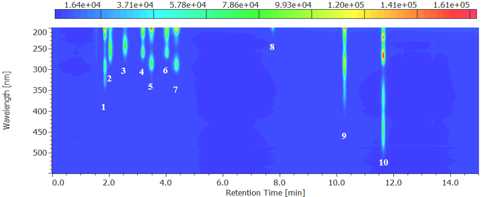 Figures 1 show the chromatograms of the calibration solution for 10 mg/L water-soluble vitamins obtained by HPLC with a PDA detector at detection wavelengths of 210 and 260 nm, respectively. Figure 2 shows the corresponding HPLC contour plot. Table 1 shows the reproducibilities of the retention times and peak areas, the correlation coefficients for the calibration curves (each from 1.0 to 25 mg/L), the detection limit, and the quantification limit. For all components, good results were obtained, with reproducibilities of ≤ 0.1% for retention time, and ≤ 2% for peak area. The calibration curve exhibited good linearity, with a correlation coefficient (r) of ≥ 0.9990.