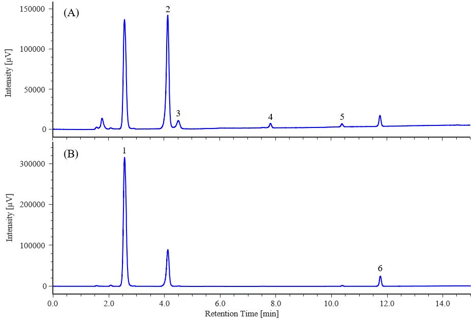 Fig. 4 Chromatograms of multivitamin tablet (A): 210 nm, (B): 260 nm