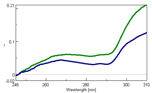 Figure 1. Fluorescence anisotropy spectra of the denaturation of α-lactalbumin by GuHCl. The green line indicates 0.02 mg/mL α-lactalbumin, 0.1 mM EDTA in the absence of GuHCl, and the blue line is 0.02 mg/mL α-lactalbumin, 0.1 mM EDTA in 3.4 M GuHCl.