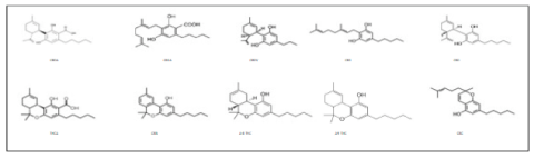 The cannabinoid standard consisting of the cannabinoids shown in figure 1 was obtained from Cayman Chemicals. The terpenes sample containing 19 terpenes was obtained from Restek. The columns used were Lux Cellulose-2 (5um 4.6 x 250mm), IB N-5 (5um, 4.6 x 250mm) and Finepak SIL C18 (5um, 4.6 x 150mm) for the separations using a Carbon Dioxide and Ethanol. The JASCO SFC-4000 with Advion CMS L Mass Spectrometer was used for the analysis.