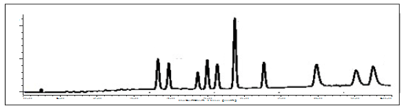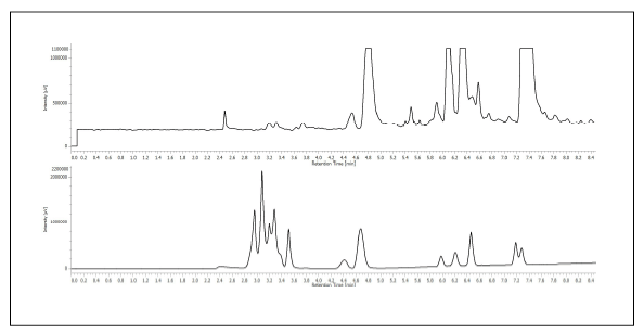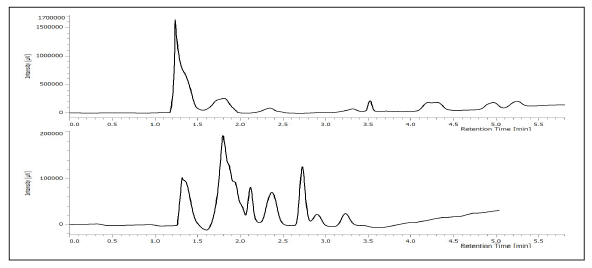 The mass spectrometer TIC is shown below and stacked above the 210nm chromatogram showing the coinciding signal from each for the terpenes. Additional terpenes that were not seen on the UV appear on the mass spec. TIC between minutes 5 and 6.