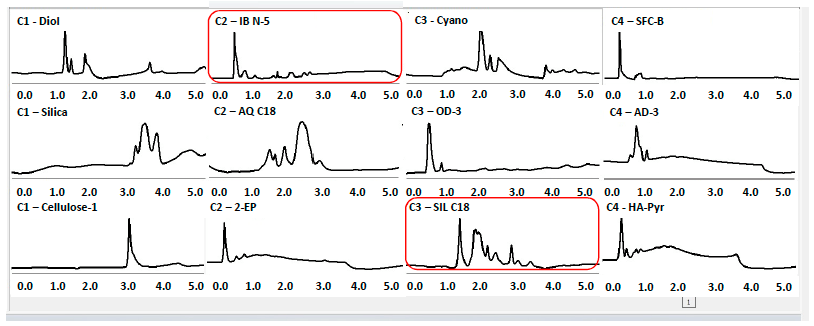 For terpenes, the results of the parallel 4 column screening of 12 columns is shown below in Figure 3. A variety of columns were used with the names listed above each chromatogram. Most columns showed little retention/separation with the exception of the two columns IB N-5 and SIL C18.