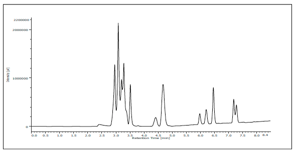 The 10 cannabinoids are separated and identified in less than 10 minutes as shown in figure 2. This has been established and scaled up for preparative purification for individual cannabinoid standards or for modifications to the mixture for different applications.