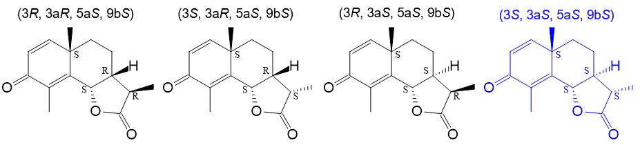 Based on the planar chemical structure of santonin (Figure 1), the four expected stereoisomers shown in Figure 3 were input and calculations were performed.