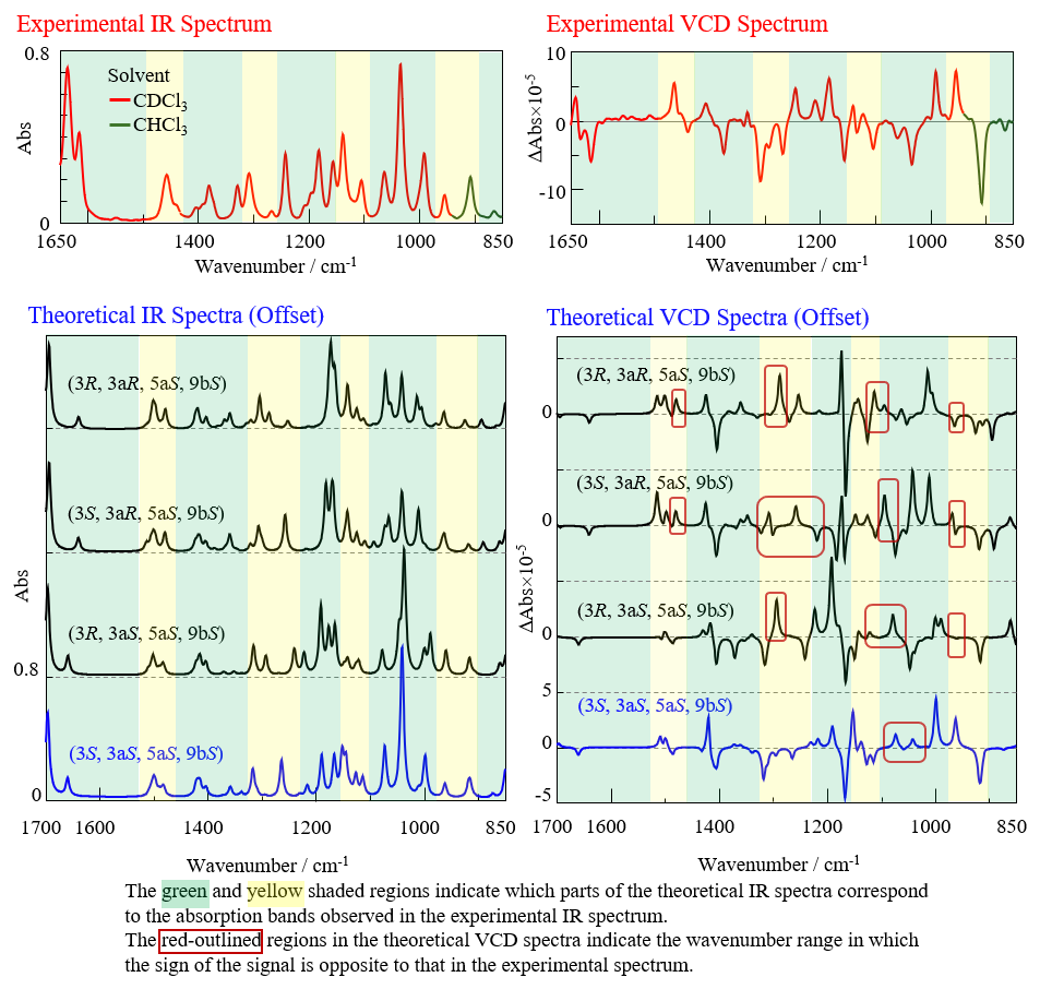 In this study, we assigned absorption peaks in the IR spectrum (Fig. 5) that had similar intensity ratios relative to their surrounding peaks as corresponding peaks. By comparing the VCD signals associated with these absorption bands, the structure showing the closest agreement was determined as the absolute configuration.