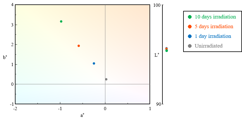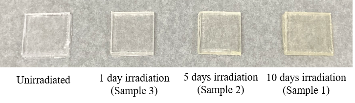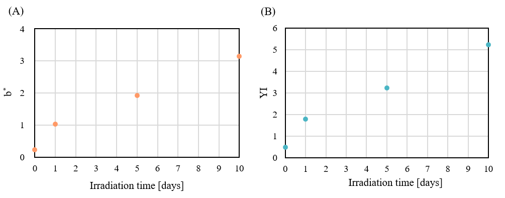 Figure 1 shows the procedure used for the photodegradation test. For light irradiation, a xenon accelerated weathering tester (SOLARBOX 1500e, manufactured by Cofomegra, provided by JASCO INTERNATIONAL Co., Ltd.) was used, with irradiation performed at an irradiance of 60 W/m² and a temperature of 65 ºC. Three test samples were sequentially inserted into the weathering tester at different times to give total irradiation times of 10 days, 5 days, and 1 day for Samples 1, 2 and 3, respectively. After irradiation was completed, the test sample were observed to change color from transparent to yellow, as shown in Figure 2. The samples were measured using a V-750 UV-Vis spectrophotometer to calculate the color (L*, a*, b*) and yellowness (YI, Yellow Index) in order to quantitatively evaluate the degree of degradation.