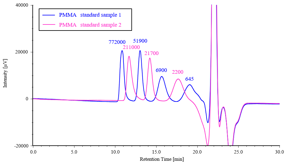 Figure 5 shows chromatograms for two PMMA samples (standard sample 1 and 2), and Figure 6 shows the resulting calibration curve.