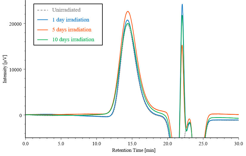 Figure 7 shows chromatograms for the PET test samples subjected to photodegradation testing, together with that for an unirradiated sample. Figure 8 shows the corresponding differential molecular weight distribution curves, where the horizontal axis represents the logarithm of the molecular weight to make it easier to observe changes in the distribution. It can be seen that the peak tops shift towards lower molecular weight as the irradiation time increases. On the other hand, the right-hand tails of the curves shift toward higher molecular weight with increasing irradiation time.