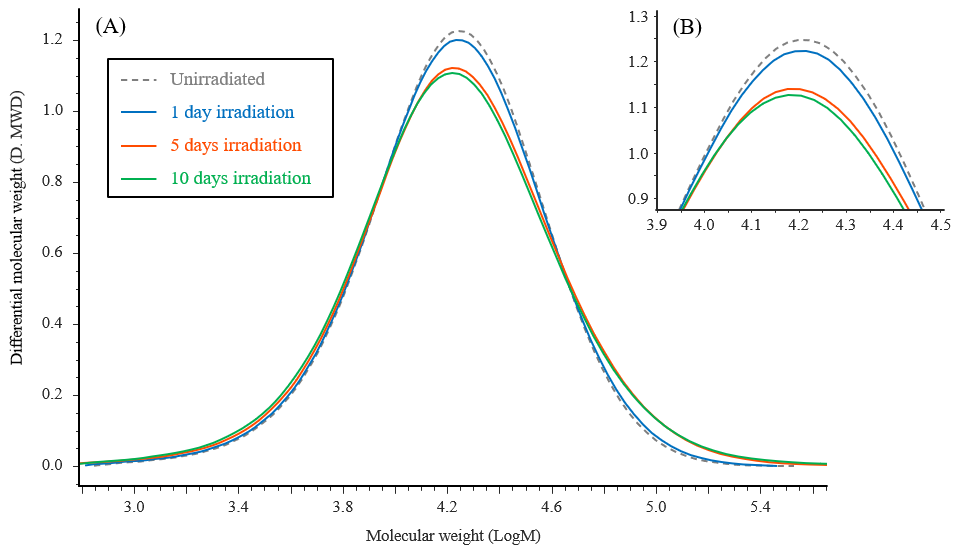 Furthermore, to measure the degraded layer of the test samples using GPC, Plane type Slicer (Slice Master KS-10, provided by JASCO Engineering Co., Ltd.) was used to remove the degraded layer from the irradiated surface of the test samples. The cut fragments were dissolved in the mobile phase to a concentration of 0.1 % (w/v) for use as the GPC measurement samples.