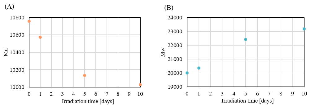 Table 2 shows the PMMA-equivalent average molecular weight calculation results, and Figure 9 shows the changes in the number-average molecular weight (Mn) and weight-average molecular weight (Mw) with irradiation time. As the irradiation time is increased, Mp and Mn decrease and Mw increases. This suggests that both decomposition of the PET main chain and intermolecular crosslinking occur simultaneously under light irradiation.