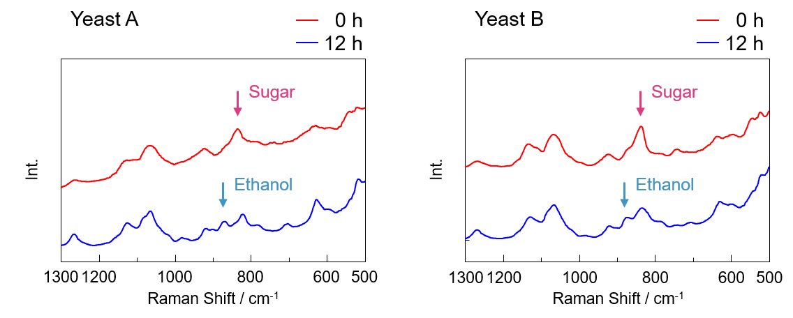 In the spectra shown in Figure 2, a peak associated with sucrose (hereinafter referred to as sugar) was observed at the start of the measurement independent of the yeast type, and an additional peak associated with ethanol was observed 12 hours after the start of the measurement.