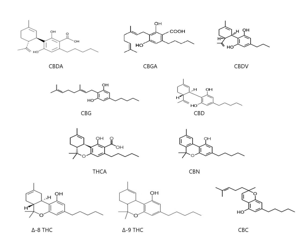 The cannabinoid standard consisting of the cannabinoids shown in figure 1 was obtained from Cayman Chemicals. A chiral column from Chiral Technologies was used for the separation using water and acetonitrile or methanol. The quaternary HPLC with a UV detector was used for the analysis.
