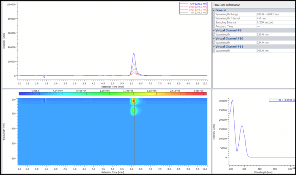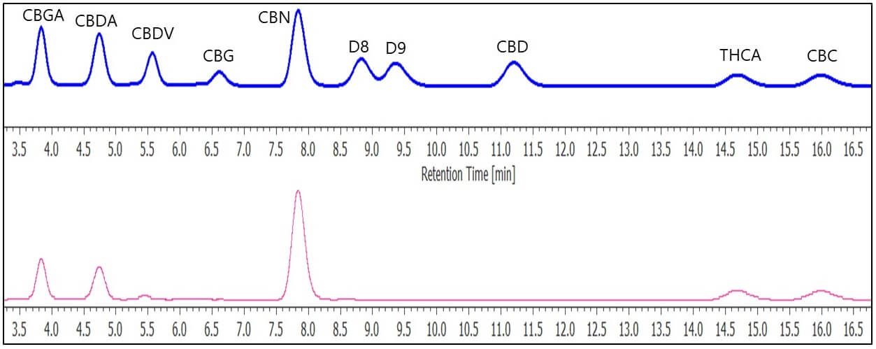 The 10 cannabinoids are separated and identified in less than 17 minutes as shown in Figure 2. This isocratic method included 0.1% TFA.