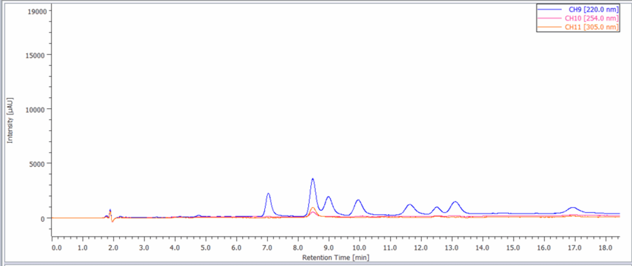 Figure 3 shows the additive free conditions provide good separation of the 8 cannabinoids, although it can be optimized further. It also allows for the easy scale up to Prep for purification of CBD or other cannabinoids.