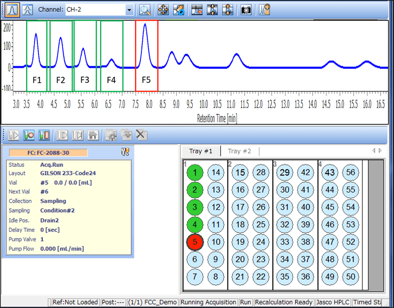 The preparative purification is shown in Figure 4. Multiple cannabinoids were collected for individual analysis for purity. The resulting fractions show 100% purity as shown in the fraction chromatogram in Figure 5.